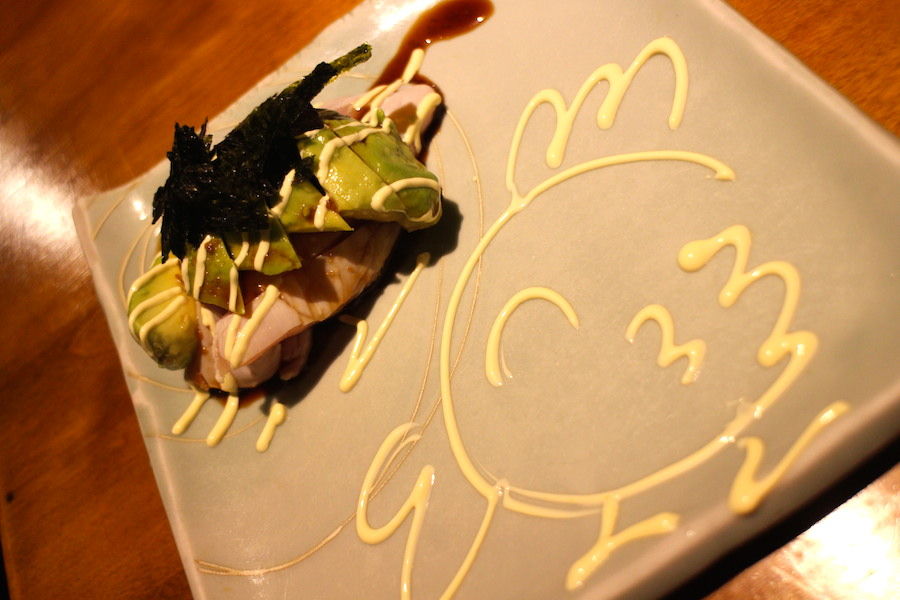 鶏のかわいいイラストがマヨネーズで書かれていて、とってもお茶目。