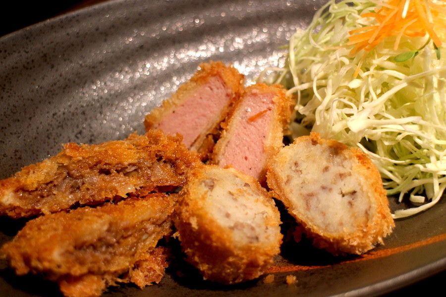 お次は揚げ物を。メンチカツからコロッケ、分厚いハムカツの3種類が楽しめる