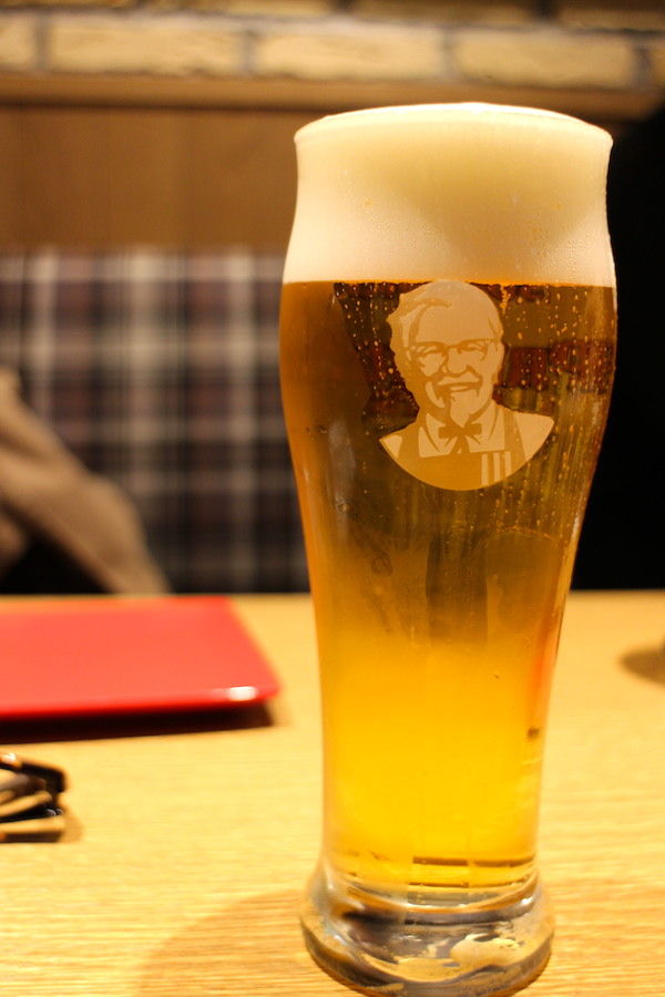 一杯目はビールを。頼んでみるとカーネルおじさんがグラスに。とってもかわいい。