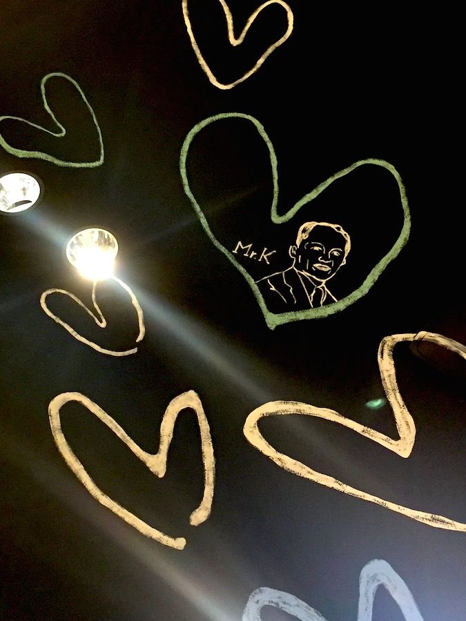 の席など様々。また、天井に目を向けるとこんなかわいいチョークアートが。