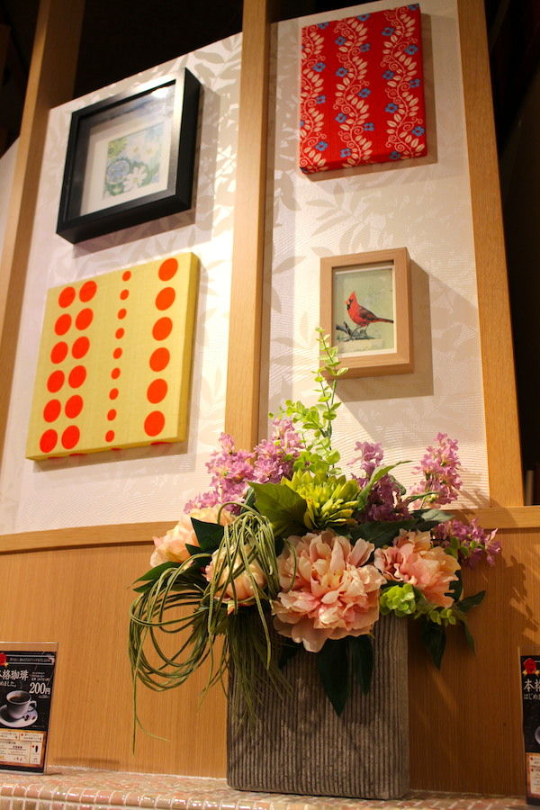 行った当日は確か週末の夕方近くだったと思うが、テーブル席はほぼお一人様やお子様連れで一杯だったため、カウンター席に。腰かけると目の前に素敵なインテリアやお花が。