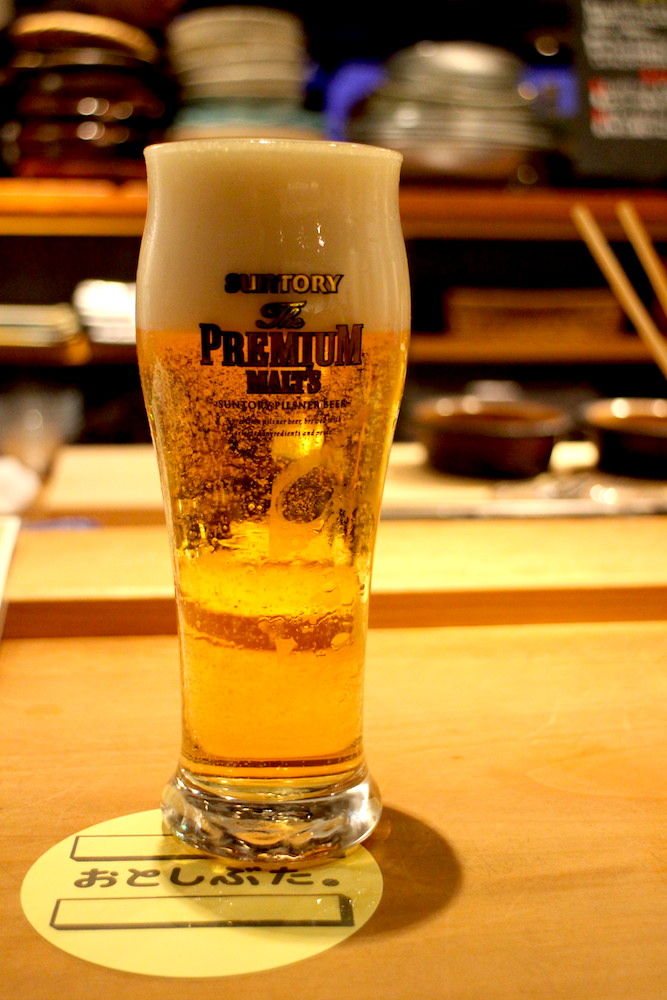 最初の一杯は最近よく飲む?プレモルを。昔はよくスーパードライを飲んでいたが、最近はこのモルツが大分定着して好きになり、ビールでお店を選んでしまうこともしばしば。最初の一杯って大事ですよね。
