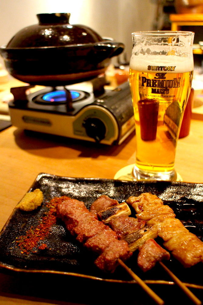 名物のお鍋はもつ鍋、梅タンしゃぶしゃぶ、豚トロトロロ鍋の3種から選べる。もつ意外の2種類が気になり、一番レアなトロロ鍋をチョイス。どういった鍋なのかわくわくしながら、出来上がるまで串焼きを注文。