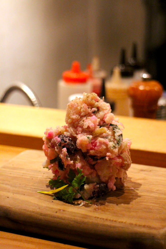 こちらはシバ付けのポテサラ。見た目も美しく、また丁度良い塩分でお酒が進みます。お箸が止まらなくなる美味しさ。