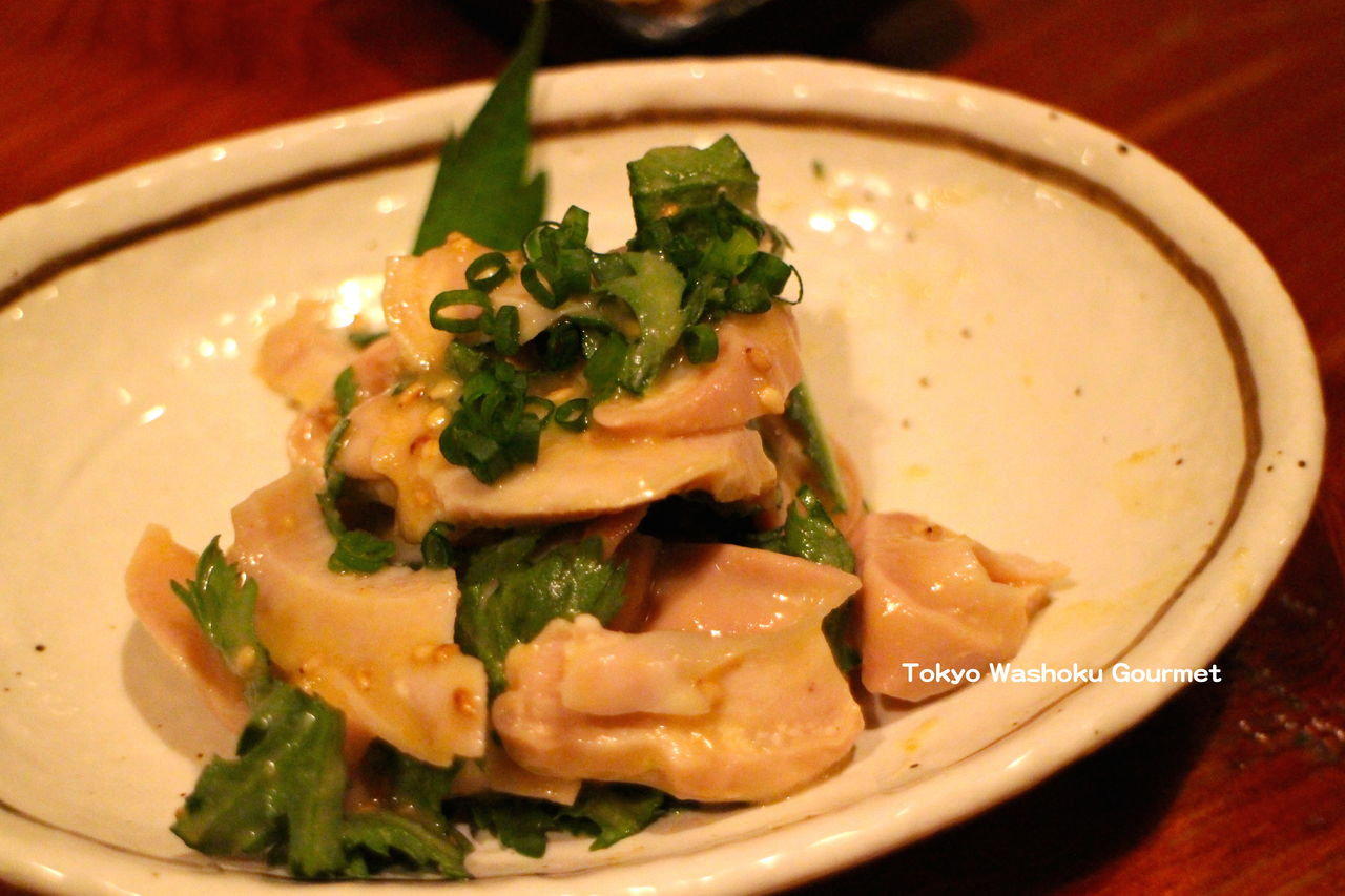 こぶくろ刺し。さっぱりしていて前菜には最適な一品。これは一番のお気に入りかもしれない。コリコリの食感と塩っけがたまらない。これだけで何杯もお酒を頼めそうだ。
