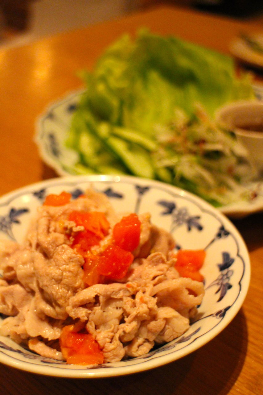 次に気になったのは、おすすめメニュー内に入っていた塩トマトの豚しゃぶ。名前の通りトマトの塩分が強いので、何もつけずそのままで楽しめます。サイドで一緒に提供されたレタスやきゅうりと一緒にサムギョプサル的な食べ方で食べるのも◎。さっぱりとしたものが食べたいならおすすめです。