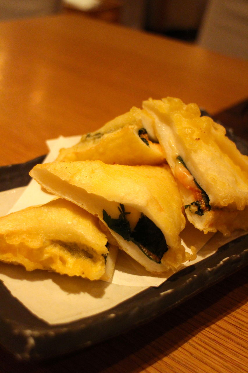 はんぺん明太チーズ揚げ。懐かしい食材の中にお酒のお供には欠かせない明太子とチーズが入っています。これはお酒好きにはたまらない一品。トロットロの中身は思わずほっぺたが落ちそうになりました。