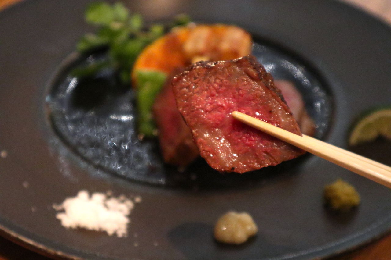 サイドに付いている柚子胡椒、ニンニクや塩をお好みでつけていただくシンプルな一品。お肉そのものの味を堪能したく、私は塩を少しつけて食べてみた。身は柔らかく、口に入れた瞬間じゅわ〜っととろけ出す。病みつきになる食感と味わい。