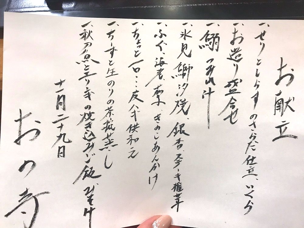 場所は神楽坂。駅から徒歩5分内の所にある「和食 おの寺」。店内に入ると笑顔が素敵な店主さんとスタッフのみなさまが迎えてくださった。席数は全体で15席。カウンター席と掘りごたつの個室のみのお店。19時予約だったが、既に満席。そして、たまたまだろうが女性客が一人もいなく、なんだかドキドキしながらカウンターの席へ。よく男性が女性だらけのカフェに彼女と一緒に入らなければならない時、無性に恥ずかしいと聞くが、まさにその逆の感情に陥った。