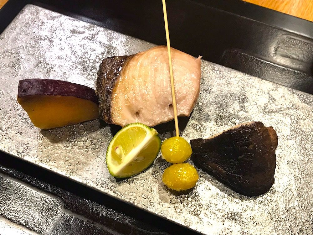 そしてコースの中で一番好みだったのはこちらの鰤。肉厚で柔らかい身は言うことなし。程よい塩加減がお腹を満たしてくれる。添えてある銀杏なども美味。思わず日本酒を頼みたくなってしまった。