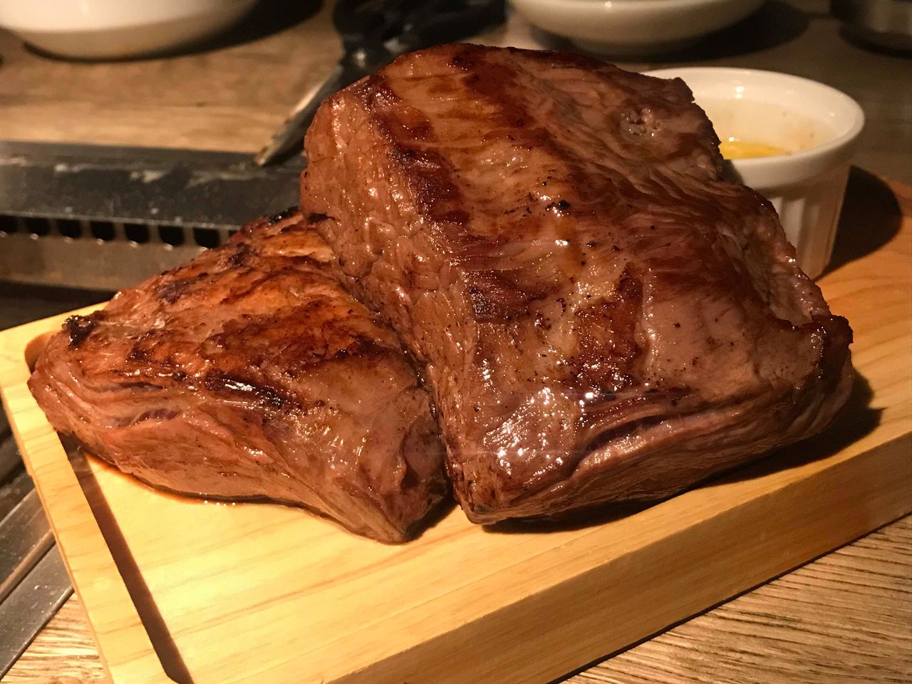 こちらは単品オーダーした、カイノミとハラミの熟成肉。キッチンで全体を炙ってきてくださり、後の仕上げはテーブルにある網で。目の前で焼いて、熱々を食べれるのは嬉しい。しかしすごい量。これで各200gだったはず。